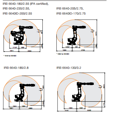 The IRB 6640 is available in multiple variations. Highly versatile","this model can transform for foundry or clean room settings. A variety of payload and reach differences allow companies to closely fit their application. These versions range from 130 kg","180 kg","185 kg","and 205 kg. Two internal dressing models are available: the IRB ABB 6640ID-200 and 6640ID-170. Contact Robots.com today to see if one of these options is right for you. <\/p>"]