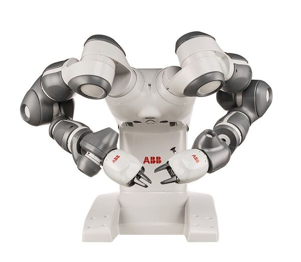 ABB's new YuMi collaborative robot is the beginning of a new era in robotics. The name itself, YuMi, stands for You and Me. YuMi is the first collaborative dual arm robot, designed to work side by side and integrated with humans. This dual arm ABB robot is ideal for small parts assembly, and is extremely safe and very accurate. With the simple human touch, the robot will stop what is is doing within milliseconds. No fencing, no light curtains, no safety systems necessary. That is because all of YuMi's safety devices are built into the robot. This robot is the future of robotics and comes with the advanced ABB IRC5 controller, TrueMove and QuickMove technology, I/O interfaces include Ethernet IP, Profibus, USB ports, DeviceNet, communication port, emergency stop and air-to-hands. YuMi can work with a variety of HMI devices, includes tablets and smartphones. Its servo grippers, or "hands", have the option of built in camera, the padding on the arm makes it soft to touch, and its 100-240 volt power supply plugs into any socket worldwide.