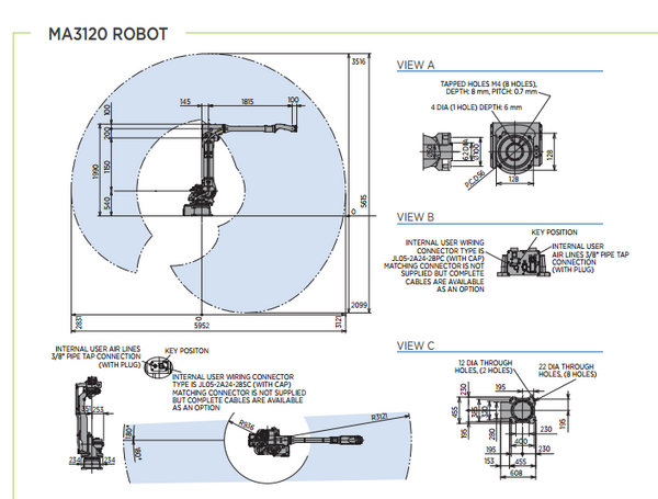 The Motoman MA3120 one of the latest Motoman arc welding robots. With a slim design, this high speed robot has a 6 kg payload, 3121 mm horizontal reach and 5615 mm vertical reach.
