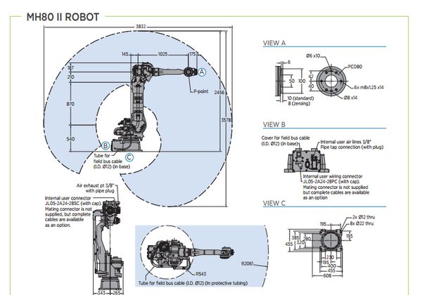 The MH80 II is a high speed, powerful handling robot that is sure to increase your production with its superior performance in dispensing, material cutting, machine tending, press tending, and other handling applications. It is a six-axis robot with a high wrist rating of IP67 that provides an increased handling capacity with a payload up to 80 kg. In addition, the MH80 II is very reliable, with its high-speed motion, high-rigidity speed reducers, and cables routed through the base and upper arm, all of which help to increase robot life and safety, while also reducing the cycle times.