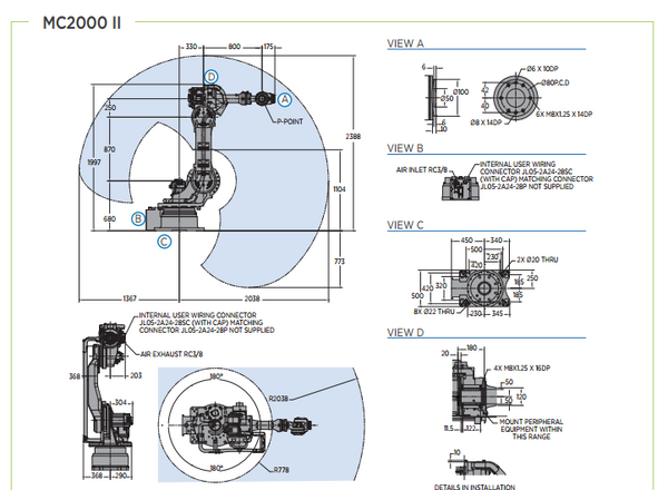 The MS100 II is a floor-mounted, heavy duty welder with a 100 kg (110 kg without spot harness) a 2,236 mm horizontal reach, 3,751 mm vertical reach, and ±0.07 mm repeatability.