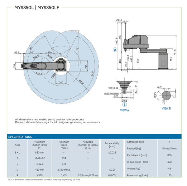 The MYS850L is the perfect solution as it has a large work envelope (850 mm reach) and long U-axis stroke (420mm), while taking up minimal workspace. Furthermore, if the floor production needs change, this robot is highly adaptable. If needed, users can choose to easily integrate vision with the affordable and extraordinary MotoSight 2D.