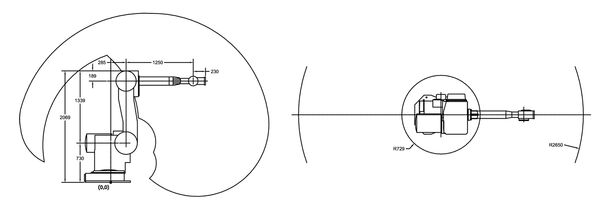The Motoman UP130 reaches 2,650 mm (104.3in) and extends behind the body to increase the work envelop and allow tools to be placed at the back of the robot and providing easy access to weld guns for maintenance.