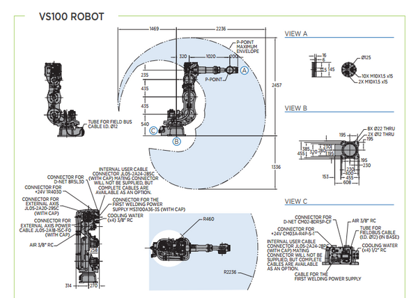 The VS100 can carry a payload up to 100 kg (110 kg without the spot harness), has a 2,236 mm horizontal reach and a 3,793 mm vertical reach, with a ±0.12 mm repeatability. The spot harness is integrated to help reduce maintenance and facilitate programming. The E-axis was added to help create a virtual variable length L arm and provides the ability to reorient the manipulator axes without changing the gun position. This arm can also fold down into a very low profile.