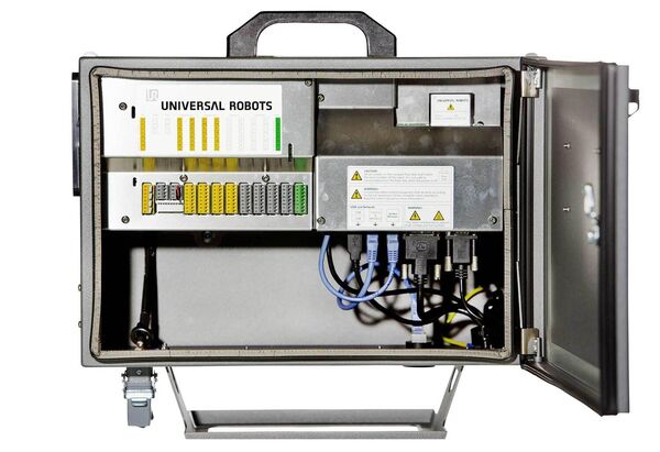 The UR10e collaborative robot is an updated version of the Universal Robots UR10. The largest of the UR series, the UR10e handles up to 10 kg of payload and a reach of 1300 mm. It has all the same specifications as the UR10, however it does have some updated features: It includes a Force Torque Sensor at Axis 6, an updated high resolution HMI with Capacitive touchscreen, and improved navigation and programming capabilities.