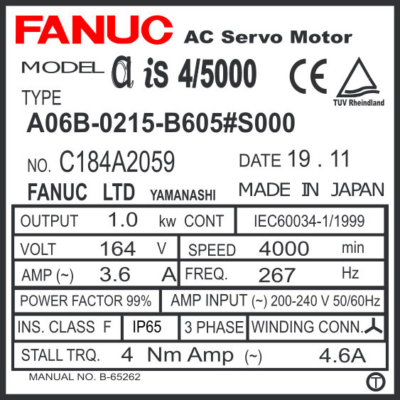 A06b-0215-B605#S000 FANUC AC SERVO MOTOR MDL AiS4/5000 TPR 90v BRK a64ia