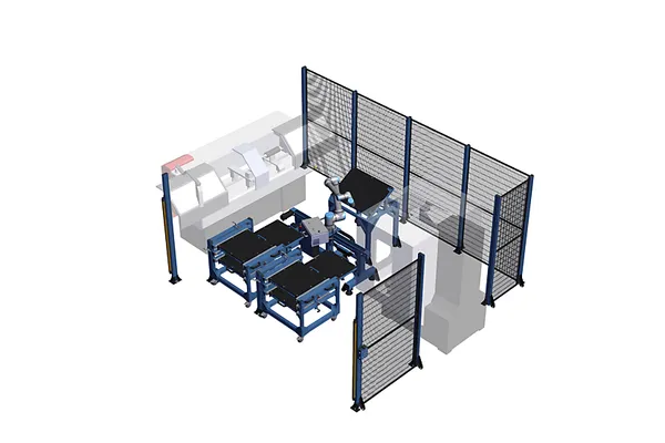 7th Axis Machine Tending Cell with Universal Robots UR10e 2 Carts with Drawers and Safety Fencing (MF-RC-276361 v10)