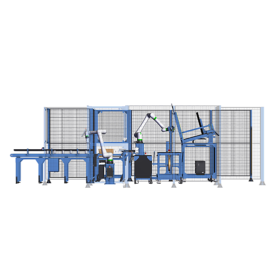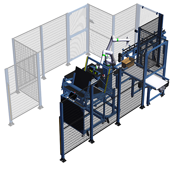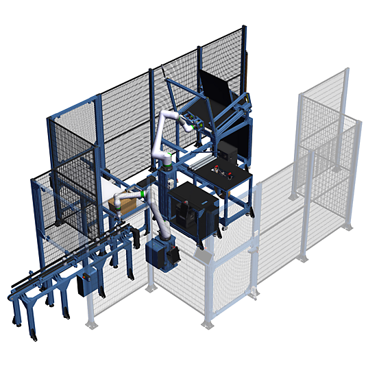 Packing robot cell with a pick and place section and a box erector solution. This is done with two Fanuc CRX10iA/L robots working autonomously with little operator interaction. Automate your manufacturing needs with this modular and cost effective set up