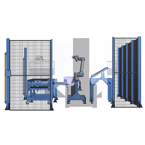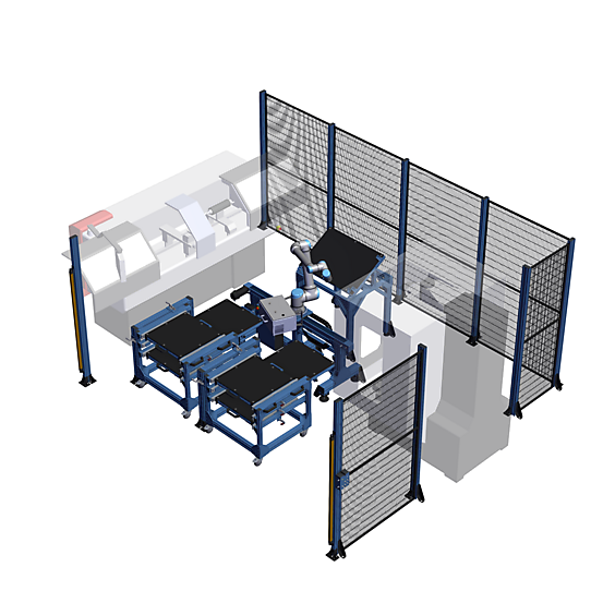 Vention machine tending robot cell with a UR10e by Universal Robots. Automate you manufacturing facility with this modular and customizable design which includes the robot kit and base, part presentation module and re-grip station.