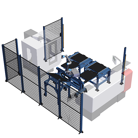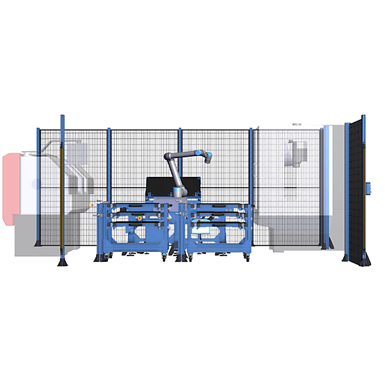 7th Axis Machine Tending Cell with Universal Robots UR10e 2 Carts with Drawers and Safety Fencing (MF-RC-276361 v10)
