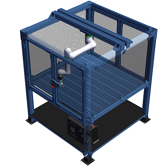 This enclosed robot workstation is designed for overhead installation of collaborative robots. Two doors are available on each side of the station, with interlocking systems to safely secure the work area. Wire mesh panels panel walls allow for a clear view of the robot. A dedicated area is available under the table top to install the robot controller and other components.