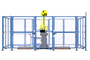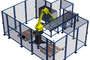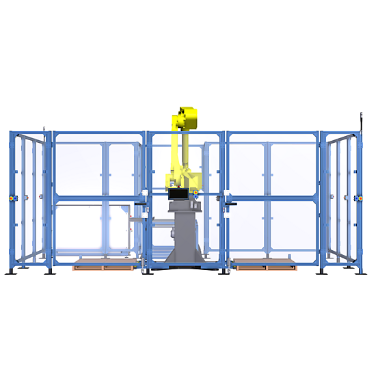 This industrial robot palletizer on pedestal is a great solution to palletize heavier products with a faster cycle time. It has been designed around the Fanuc M-710iC/45M. Two pallets can be simultaneously palletized. The Vention Pendant is installed on the fence at the front the robot cell. Includes MachineApps palletizing software. (config: IP-FM2-PD-IS-B1-S1-C-M0-H0)