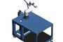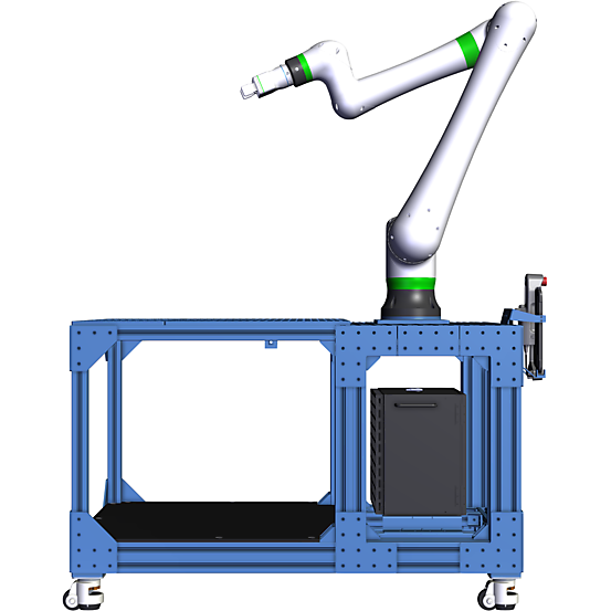 Mobile machine tending workstation designed for a Fanuc CRX robot. The part presenter is configured with fixed aluminum tooling plates that have evenly spaced M8-threaded holes. Ideal for machine tending applications, nylon pins can be added to customize nesting of each part. The workstation is 912mm wide and 1272mm long. The robot controller is protected inside the workstation. Extra storage is available under the part presenter. All the parts shown are included.