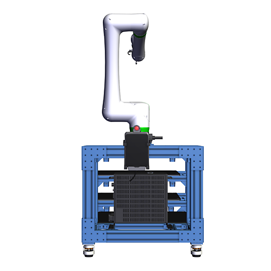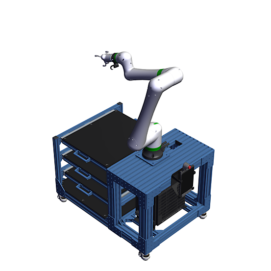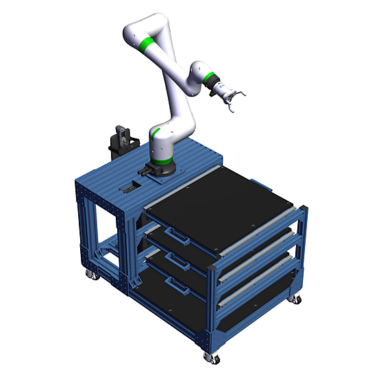 Mobile machine tending workstation designed for a FANUC CRX robot. There are 3 large drawers (630x720mm) with bi-directional slides to allow easy opening of the drawers on each side of the cart. The workstation is 912mm wide and 1266mm long. The robot controller is protected inside the workstation. All the parts shown are included.